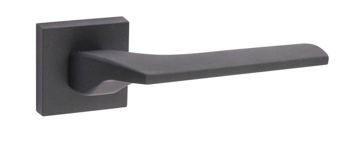 Hochwertiger Fimet Türbeschlag CORSA aus massivem Edelstahl absolut rostfrei auf eckigen Rosetten mit glasfaserverstärkter Kunststoffunterkonstruktion für besonders lange Lebensdauer. Die in italienischem Trend Design gehaltene Rosettengarnitur passt zu Innentüren aus verschiedenstem Holz und hebt sie durch ihre außergewöhnliche Form hervor. Ansprechender Retro Türbeschlag für Innentüren, Nebeneingangstüren und Zimmertüren aus Holz, fest-drehbar gelagert mit Rückholfeder.